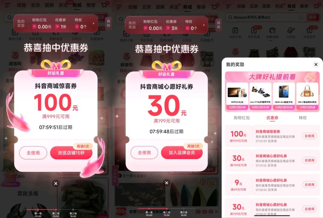 12 月 20 日至 12 月 31 日,参与活动抽奖,就有机会 1 分钱抽取抖音商城双旦锦鲤大礼包,也有机会 1 分钱低价抢 88 家近 8 万件大牌好礼,还可能获得抖音商城千万元购物红包及优惠券。