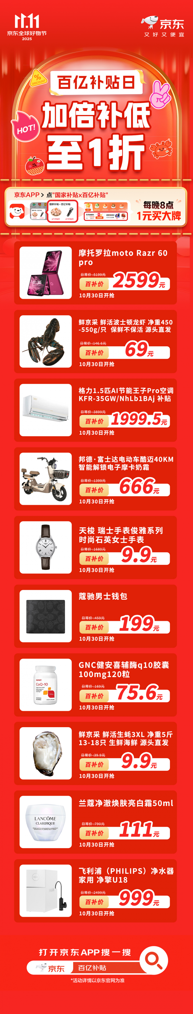 除了“天天1元抢”的震撼福利,10月30日晚8点至11月1日,京东国家补贴×百亿补贴频道还将精选多款爆品,加倍补低至一折,不用凑单、不用等满减,至高可省万元。