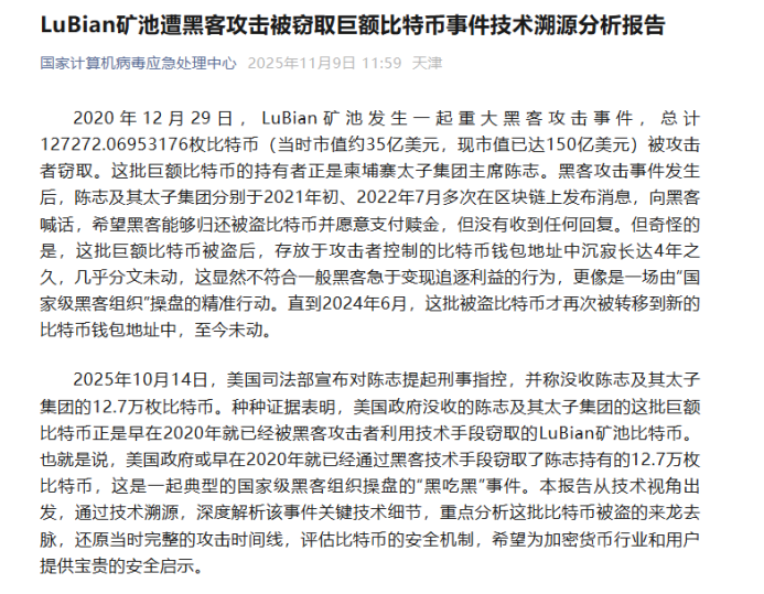 国家计算机病毒应急处理中心的报告明确界定了事件的技术本质:LuBian 矿池存在技术合规缺失,但这一漏洞仅为资产被盗提供了客观条件,不能等同于资产原持有人存在主观过错,更不能成为其承担法律责任的依据。