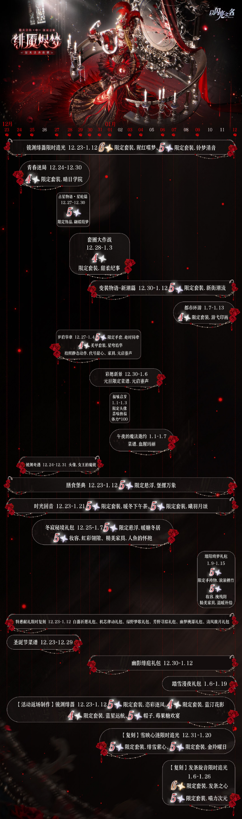 这套猩红噬梦六星套装以文艺复兴贵族穿搭为基底的裙装,锚定了血腥玛丽传说的时代背景,既有指向英格兰女王玛丽一世的说法,也有欧洲民间关于镜中怨灵的传闻,而文艺复兴时期的贵族服饰风格,恰好成为连接历史与传说的视觉桥梁。