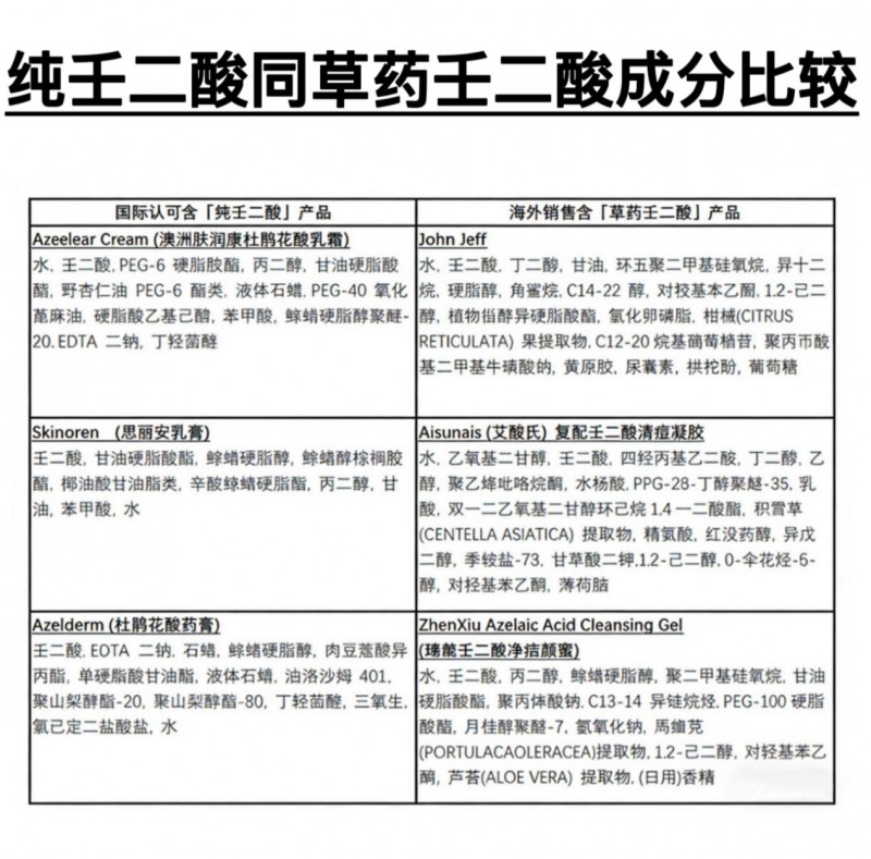 它们并没含有草药或植物,壬二酸用的是纯化学壬二酸。 纯壬二酸是经过近50年临床验证的有效成分,具有祛痘祛斑功能且安全性高。其来源包括纯壬二酸本身或由油酸臭氧分解生成,成分单一,无额外植物提取物添加。